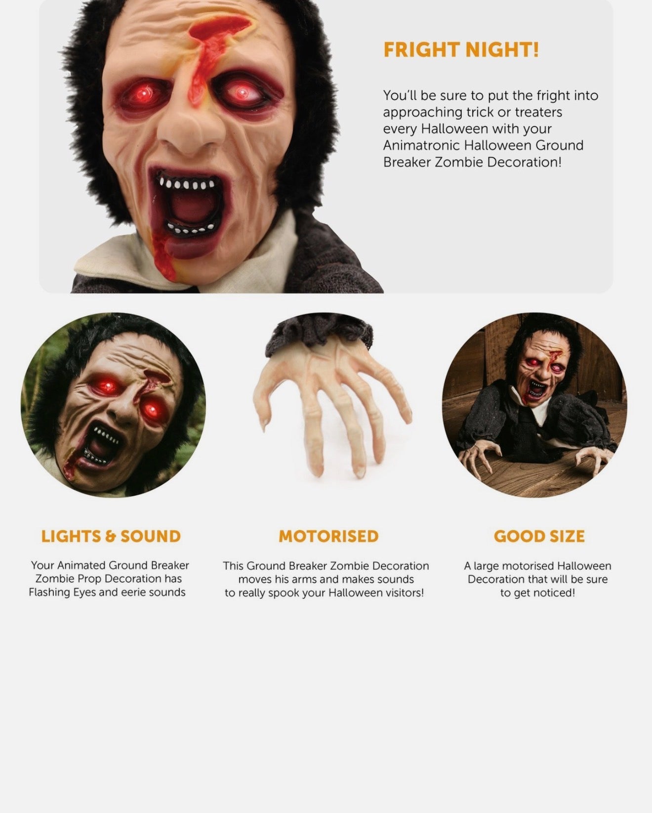 ANIMATED CRAWLING ZOMBIE DECORATION: You’ll be sure to put the fright into approaching trick or treaters every Halloween with your Animatronic Halloween Crawling Zombie Decoration!